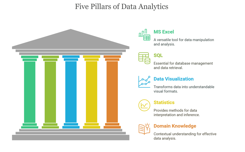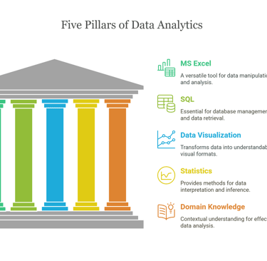This blog breaks down the five core pillars of data analytics—MS Excel, SQL, Data Visualization, Statistics, and Domain Knowledge—in a simple, practical way. With real-world examples and relatable language, it’s perfect for beginners, professionals, or anyone curious about how data can solve real problems and drive smarter decisions.
